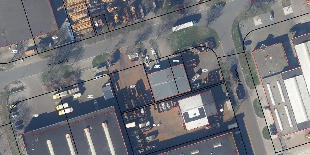 Het perceel waarop Neutronweg 5-D staat heeft een oppervlakte van 430 m². Dit is een groot perceel. De perceeloppervlakte wordt geregistreerd door het Kadaster. Gedetailleerde informatie over de maten van dit perceel kunt u vinden in het rapport Kadastrale kaart met maatvoering van Neutronweg 5-D.