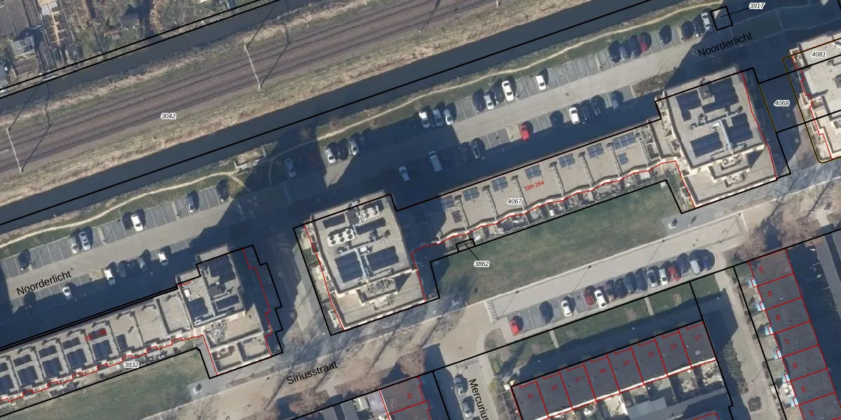 Het perceel waarop Noorderlicht 223 staat heeft een oppervlakte van 2324 m². Dit is een zeer groot perceel. De perceeloppervlakte wordt geregistreerd door het Kadaster. Gedetailleerde informatie over de maten van dit perceel kunt u vinden in het rapport Kadastrale kaart met maatvoering van Noorderlicht 223.
