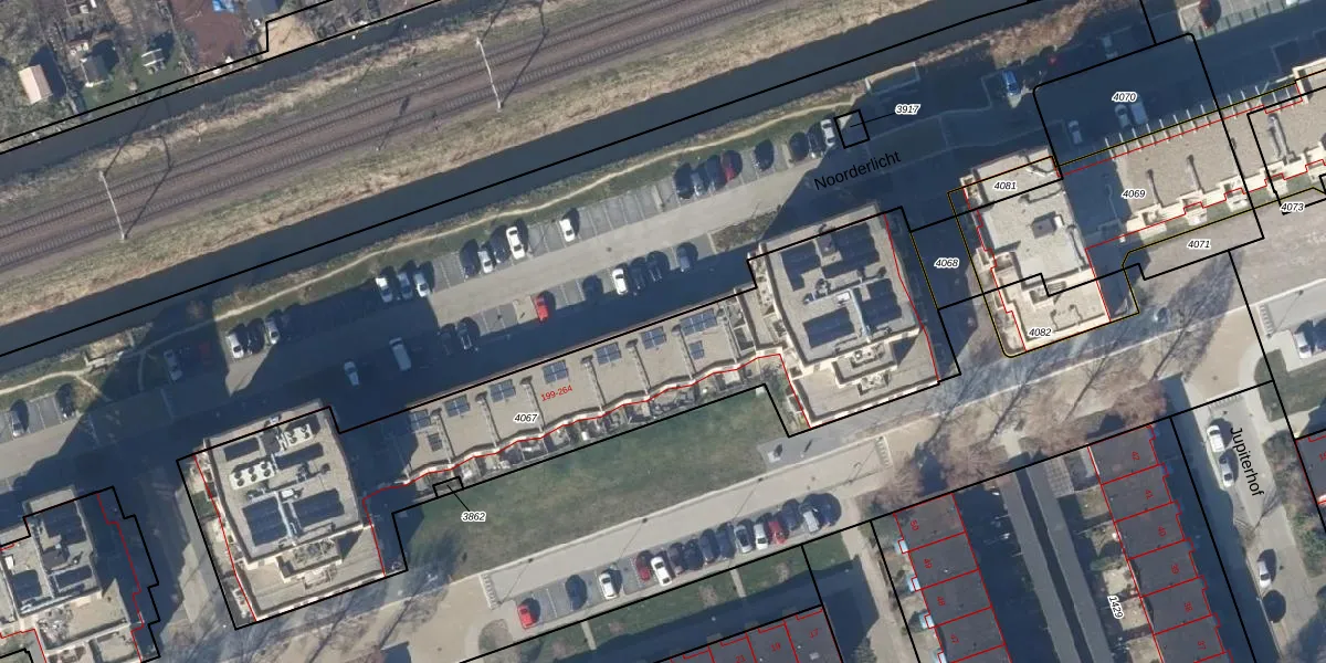 Het perceel waarop Noorderlicht 235 staat heeft een oppervlakte van 2324 m². Dit is een zeer groot perceel. De perceeloppervlakte wordt geregistreerd door het Kadaster. Gedetailleerde informatie over de maten van dit perceel kunt u vinden in het rapport Kadastrale kaart met maatvoering van Noorderlicht 235.