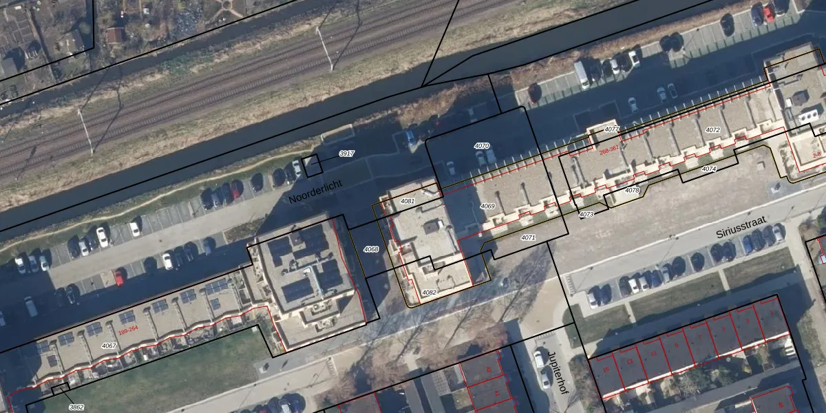 Het perceel waarop Noorderlicht 281 staat heeft een oppervlakte van 63 m². Dit is een klein perceel. De perceeloppervlakte wordt geregistreerd door het Kadaster. Gedetailleerde informatie over de maten van dit perceel kunt u vinden in het rapport Kadastrale kaart met maatvoering van Noorderlicht 281.