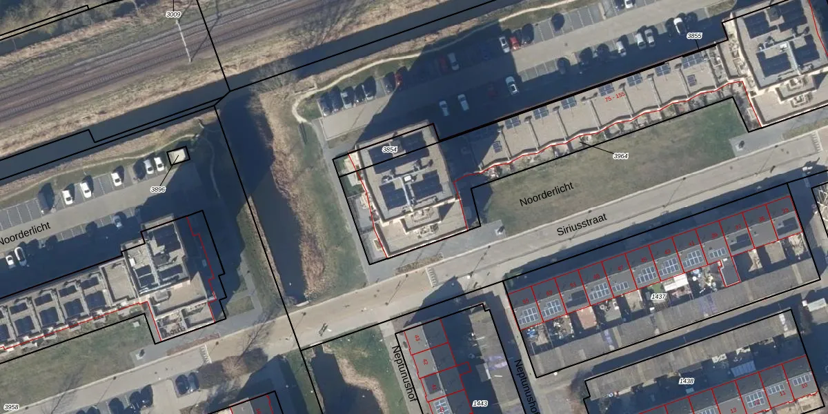 Het perceel waarop Noorderlicht 95 staat heeft een oppervlakte van 2306 m². Dit is een zeer groot perceel. De perceeloppervlakte wordt geregistreerd door het Kadaster. Gedetailleerde informatie over de maten van dit perceel kunt u vinden in het rapport Kadastrale kaart met maatvoering van Noorderlicht 95.