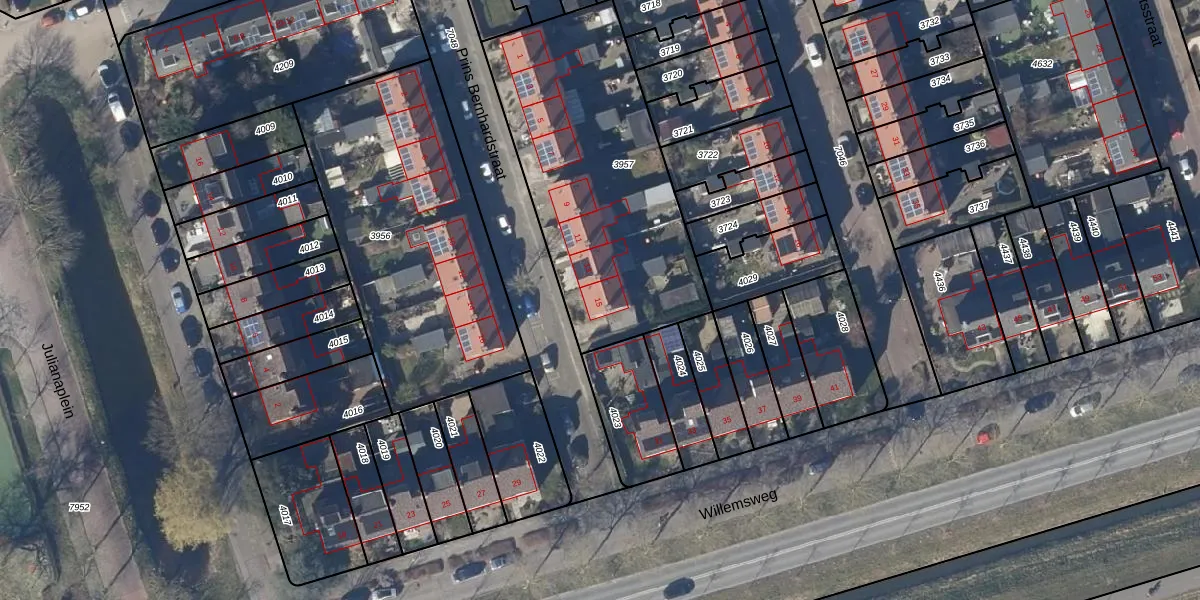 Het perceel waarop Prins Bernhardstraat 15 staat heeft een oppervlakte van 1269 m². Dit is een zeer groot perceel. De perceeloppervlakte wordt geregistreerd door het Kadaster. Gedetailleerde informatie over de maten van dit perceel kunt u vinden in het rapport Kadastrale kaart met maatvoering van Prins Bernhardstraat 15.