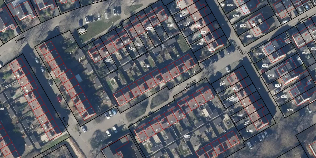 Het perceel waarop Reaal 63 staat heeft een oppervlakte van 3715 m². Dit is een zeer groot perceel. De perceeloppervlakte wordt geregistreerd door het Kadaster. Gedetailleerde informatie over de maten van dit perceel kunt u vinden in het rapport Kadastrale kaart met maatvoering van Reaal 63.