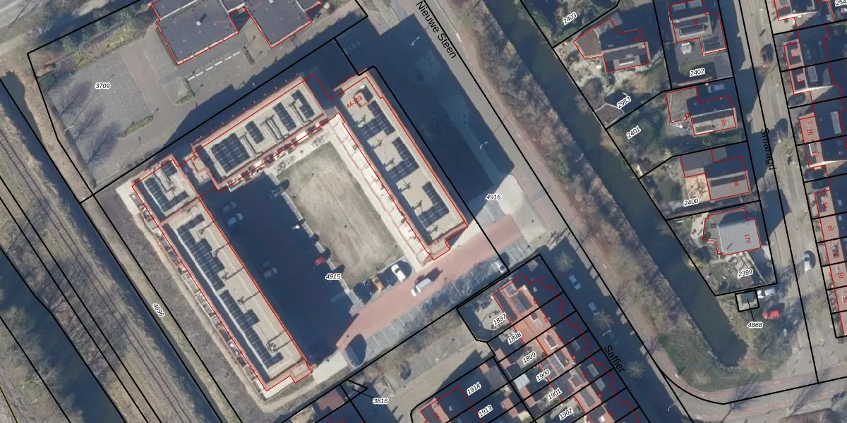 Het perceel waarop Saffier 54 staat heeft een oppervlakte van 4959 m². Dit is een zeer groot perceel. De perceeloppervlakte wordt geregistreerd door het Kadaster. Gedetailleerde informatie over de maten van dit perceel kunt u vinden in het rapport Kadastrale kaart met maatvoering van Saffier 54.