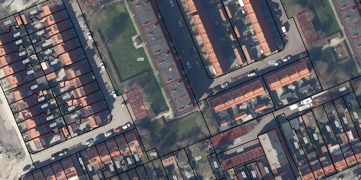 Het perceel waarop Sapmastraat 50 staat heeft een oppervlakte van 4130 m². Dit is een zeer groot perceel. De perceeloppervlakte wordt geregistreerd door het Kadaster. Gedetailleerde informatie over de maten van dit perceel kunt u vinden in het rapport Kadastrale kaart met maatvoering van Sapmastraat 50.