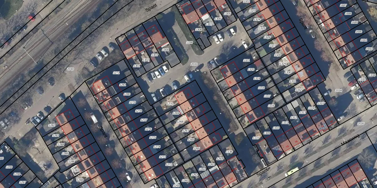Het perceel waarop Spant 56 staat heeft een oppervlakte van 196 m². Dit is een middelgroot perceel. De perceeloppervlakte wordt geregistreerd door het Kadaster. Gedetailleerde informatie over de maten van dit perceel kunt u vinden in het rapport Kadastrale kaart met maatvoering van Spant 56.