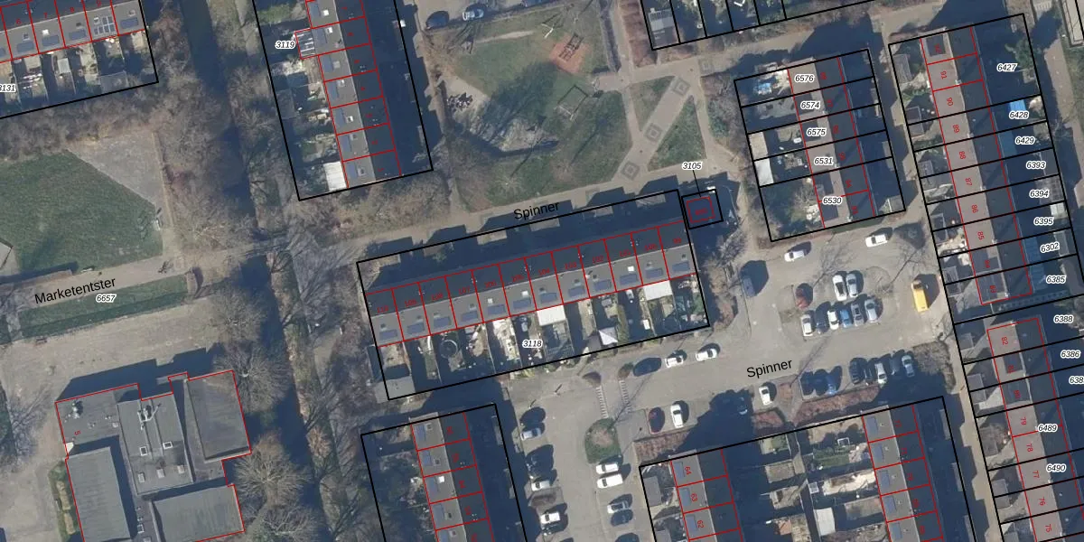 Het perceel waarop Spinner 104 staat heeft een oppervlakte van 1572 m². Dit is een zeer groot perceel. De perceeloppervlakte wordt geregistreerd door het Kadaster. Gedetailleerde informatie over de maten van dit perceel kunt u vinden in het rapport Kadastrale kaart met maatvoering van Spinner 104.