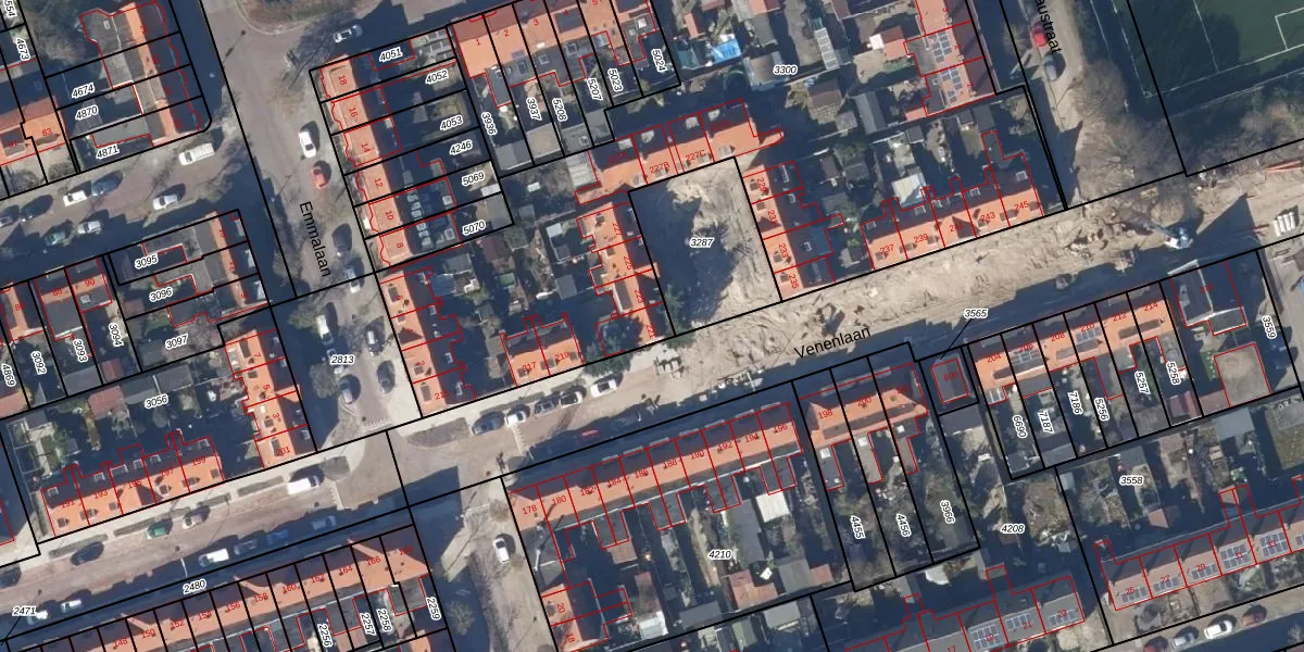 Het perceel waarop Venenlaan 221 staat heeft een oppervlakte van 3858 m². Dit is een zeer groot perceel. De perceeloppervlakte wordt geregistreerd door het Kadaster. Gedetailleerde informatie over de maten van dit perceel kunt u vinden in het rapport Kadastrale kaart met maatvoering van Venenlaan 221.