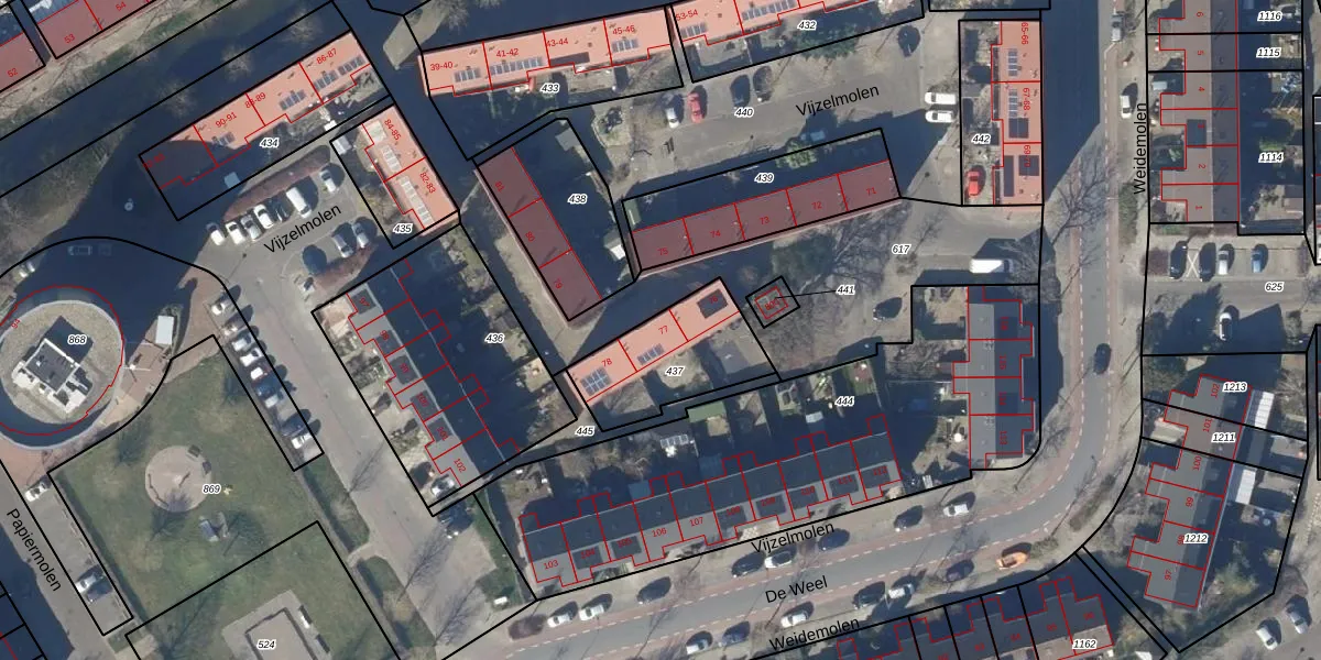 Het perceel waarop Vijzelmolen 77 staat heeft een oppervlakte van 374 m². Dit is een groot perceel. De perceeloppervlakte wordt geregistreerd door het Kadaster. Gedetailleerde informatie over de maten van dit perceel kunt u vinden in het rapport Kadastrale kaart met maatvoering van Vijzelmolen 77.