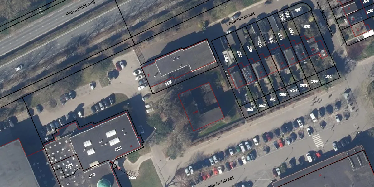 Het perceel waarop Vredehofstraat 9-A staat heeft een oppervlakte van 5,8 ha. Dit is een zeer groot perceel. De perceeloppervlakte wordt geregistreerd door het Kadaster. Gedetailleerde informatie over de maten van dit perceel kunt u vinden in het rapport Kadastrale kaart met maatvoering van Vredehofstraat 9-A.