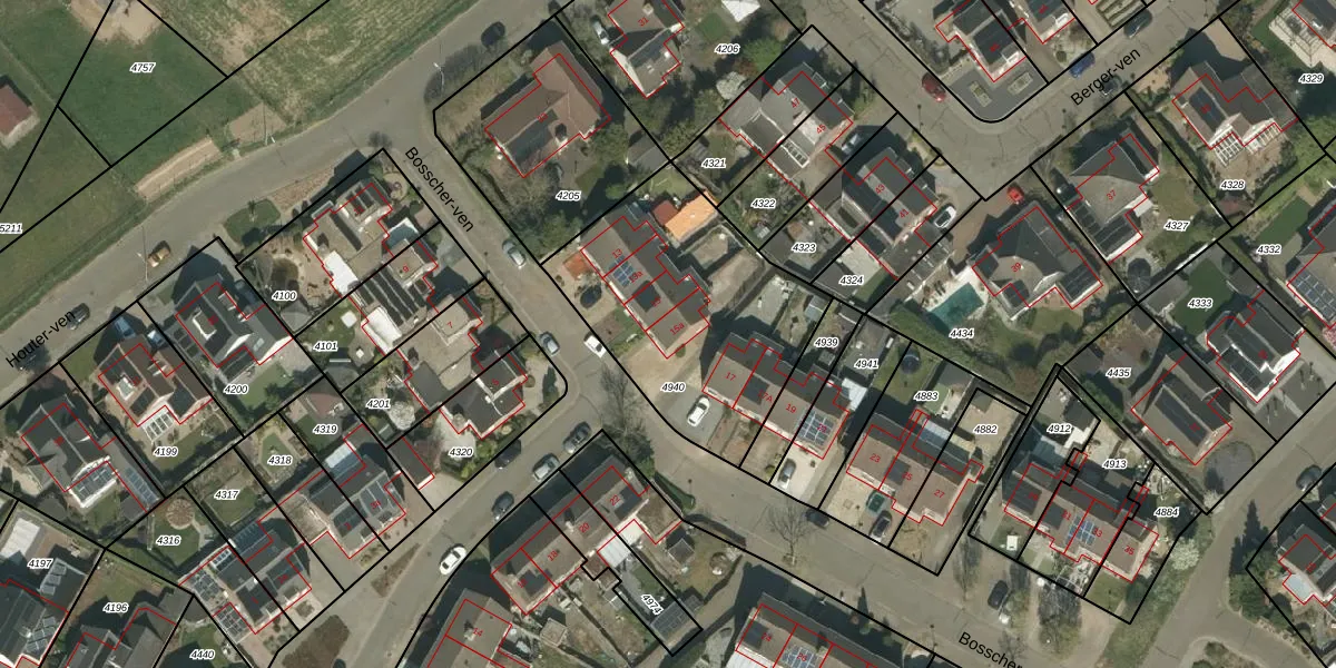 Het perceel waarop Bosscher-ven 15-a staat heeft een oppervlakte van 1019 m². Dit is een zeer groot perceel. De perceeloppervlakte wordt geregistreerd door het Kadaster. Gedetailleerde informatie over de maten van dit perceel kunt u vinden in het rapport Kadastrale kaart met maatvoering van Bosscher-ven 15-a.