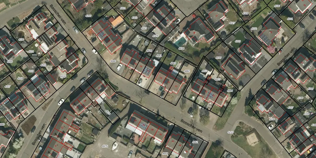 Het perceel waarop Bosscher-ven 23 staat heeft een oppervlakte van 361 m². Dit is een groot perceel. De perceeloppervlakte wordt geregistreerd door het Kadaster. Gedetailleerde informatie over de maten van dit perceel kunt u vinden in het rapport Kadastrale kaart met maatvoering van Bosscher-ven 23.