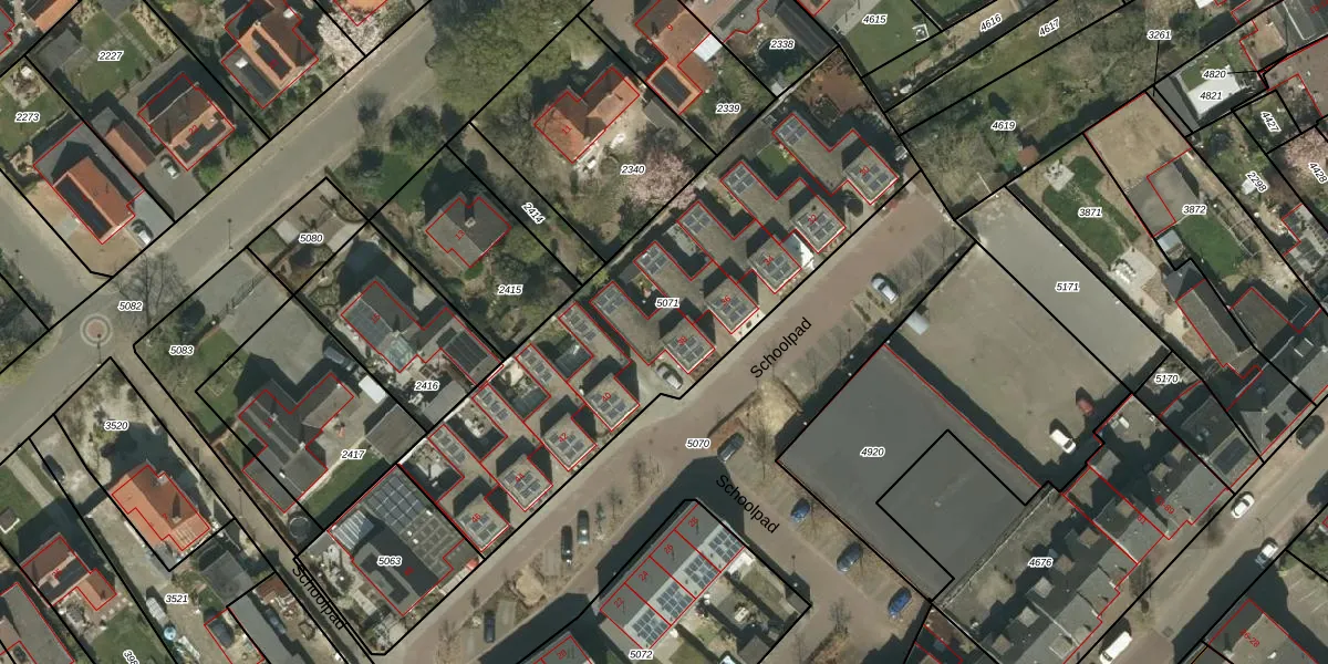 Het perceel waarop Schoolpad 38 staat heeft een oppervlakte van 1918 m². Dit is een zeer groot perceel. De perceeloppervlakte wordt geregistreerd door het Kadaster. Gedetailleerde informatie over de maten van dit perceel kunt u vinden in het rapport Kadastrale kaart met maatvoering van Schoolpad 38.
