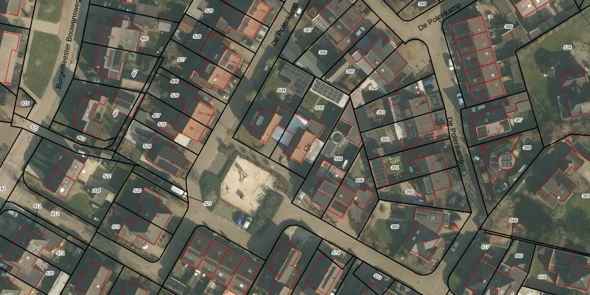 Het perceel waarop De Polenkamp 19 staat heeft een oppervlakte van 447 m². Dit is een groot perceel. De perceeloppervlakte wordt geregistreerd door het Kadaster. Gedetailleerde informatie over de maten van dit perceel kunt u vinden in het rapport Kadastrale kaart met maatvoering van De Polenkamp 19.
