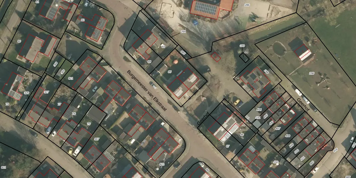 Het perceel waarop Geerhof 1 staat heeft een oppervlakte van 543 m². Dit is een groot perceel. De perceeloppervlakte wordt geregistreerd door het Kadaster. Gedetailleerde informatie over de maten van dit perceel kunt u vinden in het rapport Kadastrale kaart met maatvoering van Geerhof 1.