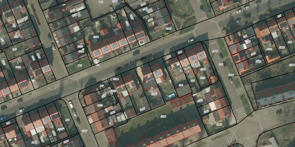 Het perceel waarop Jan van Eechoudstraat 21 staat heeft een oppervlakte van 315 m². Dit is een groot perceel. De perceeloppervlakte wordt geregistreerd door het Kadaster. Gedetailleerde informatie over de maten van dit perceel kunt u vinden in het rapport Kadastrale kaart met maatvoering van Jan van Eechoudstraat 21.