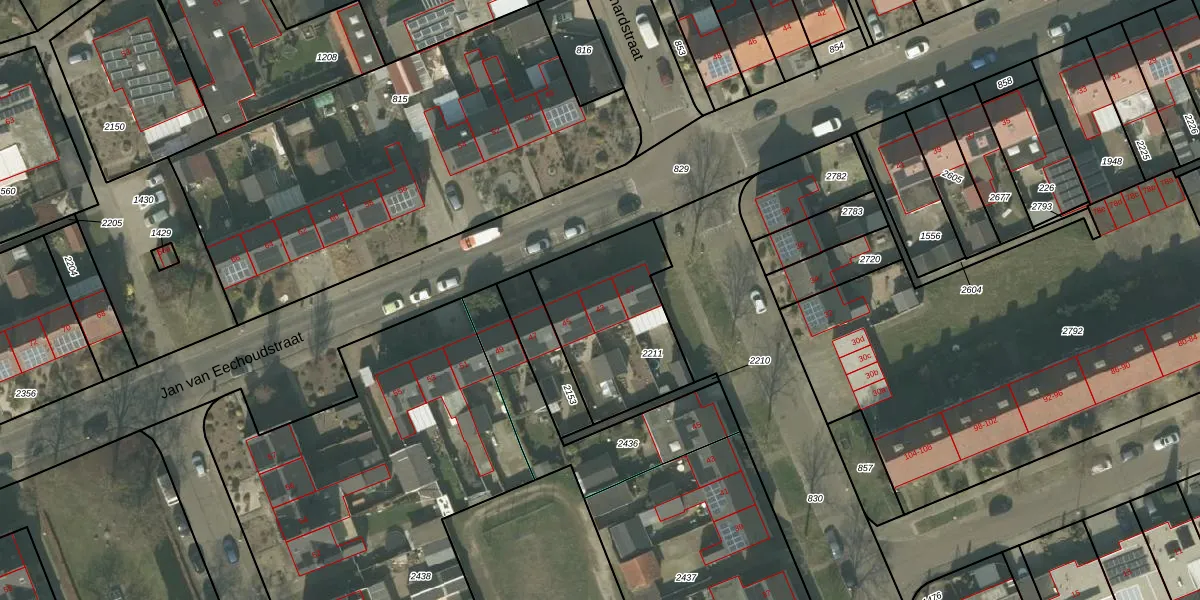 Het perceel waarop Jan van Eechoudstraat 43 staat heeft een oppervlakte van 535 m². Dit is een groot perceel. De perceeloppervlakte wordt geregistreerd door het Kadaster. Gedetailleerde informatie over de maten van dit perceel kunt u vinden in het rapport Kadastrale kaart met maatvoering van Jan van Eechoudstraat 43.