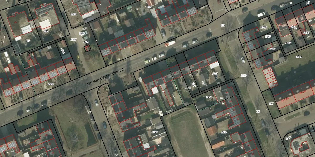 Het perceel waarop Jan van Eechoudstraat 53 staat heeft een oppervlakte van 2494 m². Dit is een zeer groot perceel. De perceeloppervlakte wordt geregistreerd door het Kadaster. Gedetailleerde informatie over de maten van dit perceel kunt u vinden in het rapport Kadastrale kaart met maatvoering van Jan van Eechoudstraat 53.