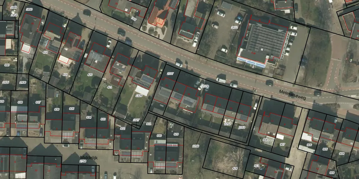 Het perceel waarop Meterikseweg 31 staat heeft een oppervlakte van 877 m². Dit is een groot perceel. De perceeloppervlakte wordt geregistreerd door het Kadaster. Gedetailleerde informatie over de maten van dit perceel kunt u vinden in het rapport Kadastrale kaart met maatvoering van Meterikseweg 31.