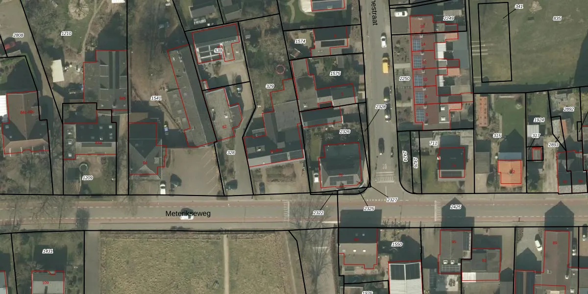 Het perceel waarop Meterikseweg 80-a staat heeft een oppervlakte van 1030 m². Dit is een zeer groot perceel. De perceeloppervlakte wordt geregistreerd door het Kadaster. Gedetailleerde informatie over de maten van dit perceel kunt u vinden in het rapport Kadastrale kaart met maatvoering van Meterikseweg 80-a.