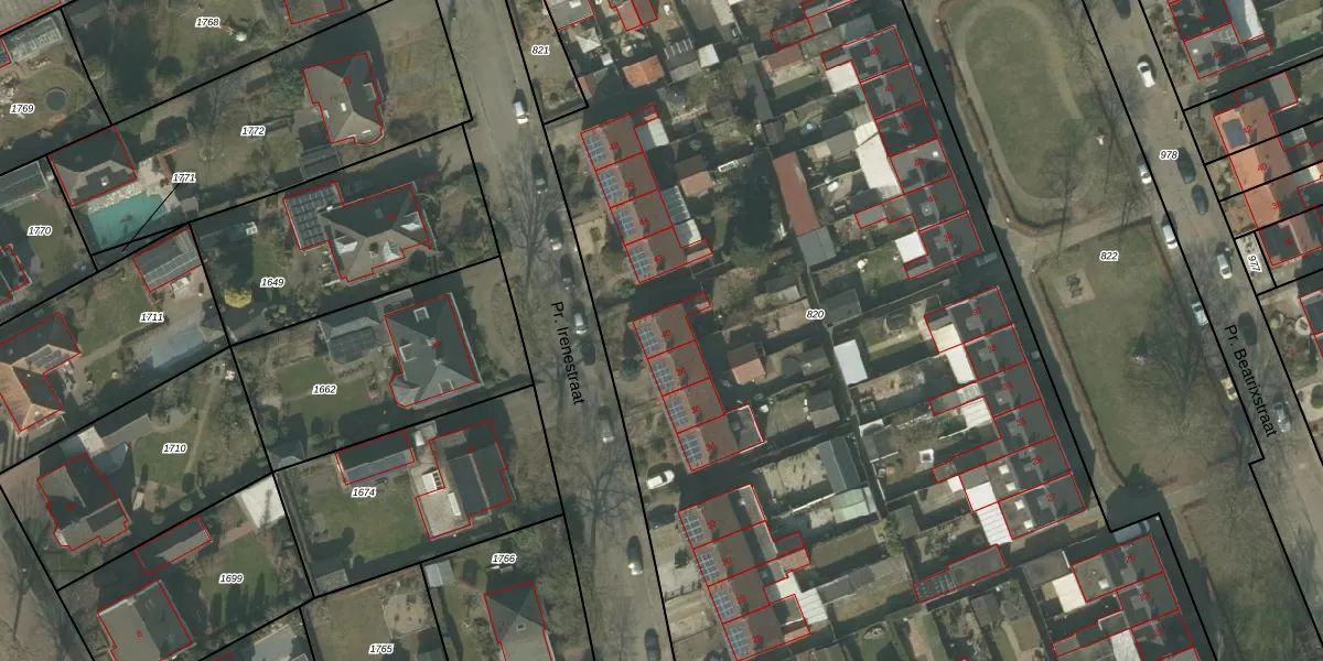 Het perceel waarop Pr. Irenestraat 40 staat heeft een oppervlakte van 9310 m². Dit is een zeer groot perceel. De perceeloppervlakte wordt geregistreerd door het Kadaster. Gedetailleerde informatie over de maten van dit perceel kunt u vinden in het rapport Kadastrale kaart met maatvoering van Pr. Irenestraat 40.