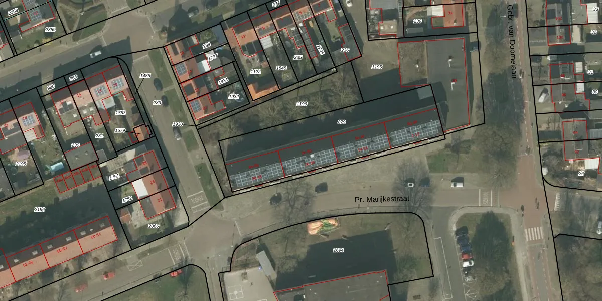 Het perceel waarop Pr. Marijkestraat 36 staat heeft een oppervlakte van 1270 m². Dit is een zeer groot perceel. De perceeloppervlakte wordt geregistreerd door het Kadaster. Gedetailleerde informatie over de maten van dit perceel kunt u vinden in het rapport Kadastrale kaart met maatvoering van Pr. Marijkestraat 36.