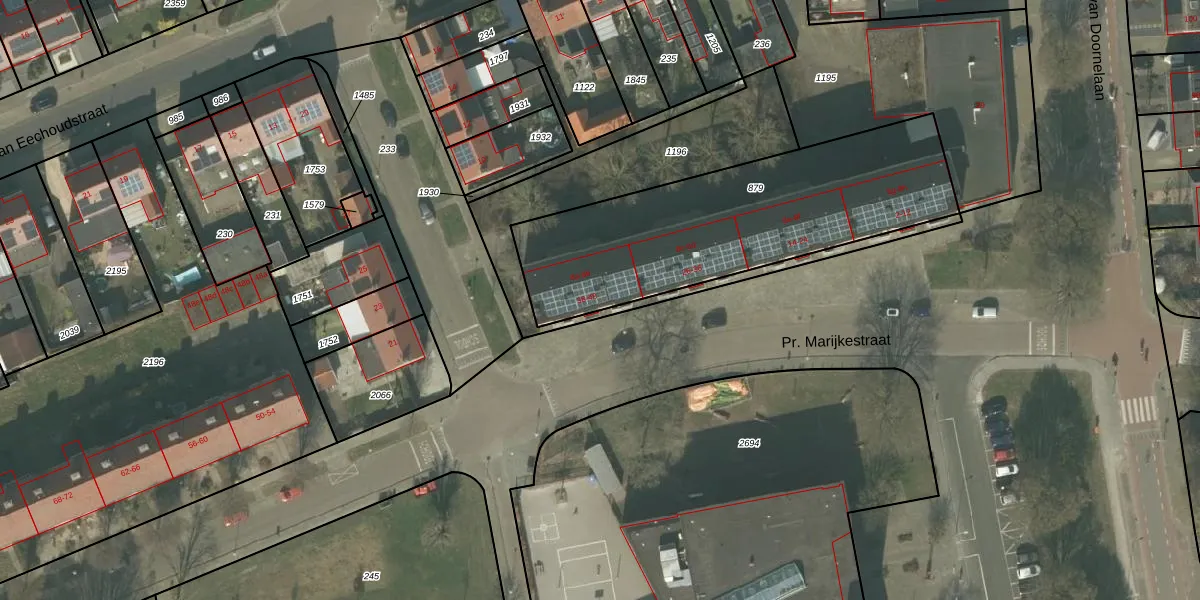 Het perceel waarop Pr. Marijkestraat 38 staat heeft een oppervlakte van 1270 m². Dit is een zeer groot perceel. De perceeloppervlakte wordt geregistreerd door het Kadaster. Gedetailleerde informatie over de maten van dit perceel kunt u vinden in het rapport Kadastrale kaart met maatvoering van Pr. Marijkestraat 38.