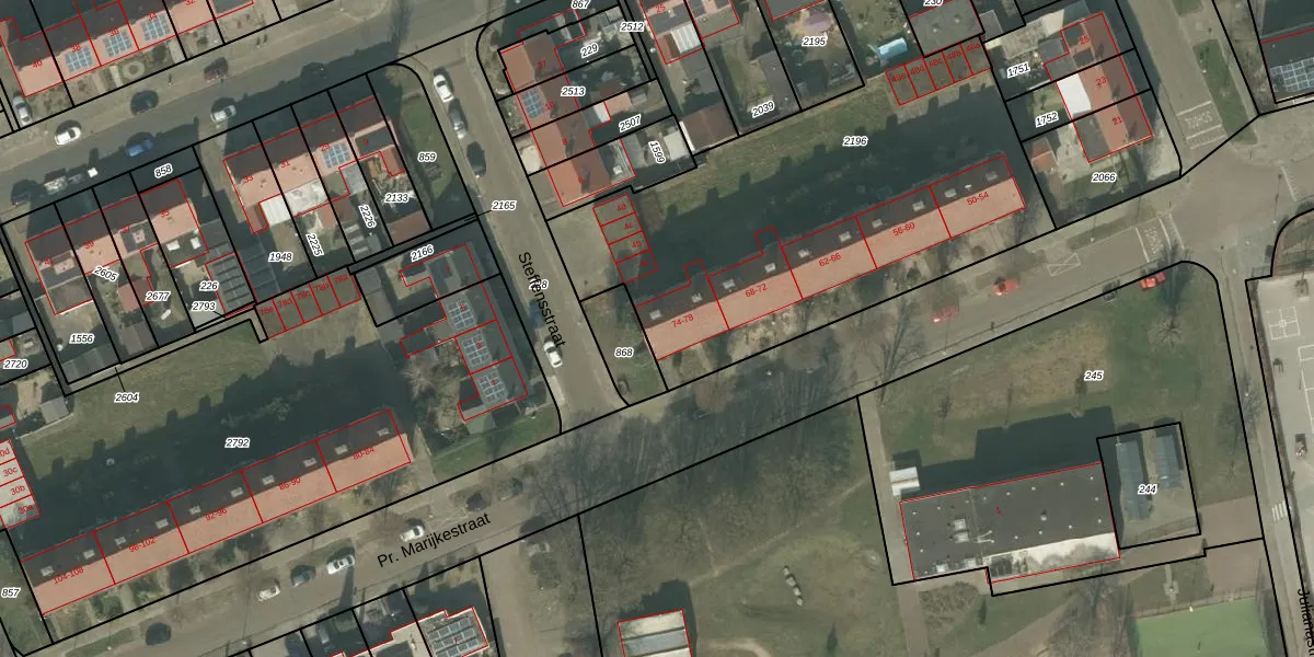 Het perceel waarop Pr. Marijkestraat 78 staat heeft een oppervlakte van 2410 m². Dit is een zeer groot perceel. De perceeloppervlakte wordt geregistreerd door het Kadaster. Gedetailleerde informatie over de maten van dit perceel kunt u vinden in het rapport Kadastrale kaart met maatvoering van Pr. Marijkestraat 78.