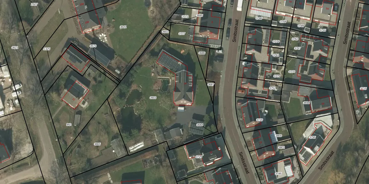 Het perceel waarop Smitsstraat 14 staat heeft een oppervlakte van 2580 m². Dit is een zeer groot perceel. De perceeloppervlakte wordt geregistreerd door het Kadaster. Gedetailleerde informatie over de maten van dit perceel kunt u vinden in het rapport Kadastrale kaart met maatvoering van Smitsstraat 14.