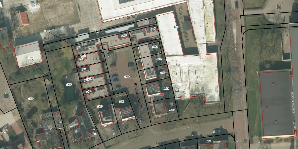 Het perceel waarop Stappersmolen 21 staat heeft een oppervlakte van 182 m². Dit is een middelgroot perceel. De perceeloppervlakte wordt geregistreerd door het Kadaster. Gedetailleerde informatie over de maten van dit perceel kunt u vinden in het rapport Kadastrale kaart met maatvoering van Stappersmolen 21.