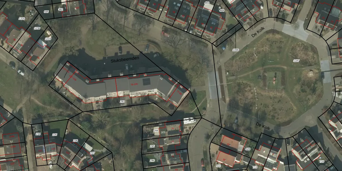 Stuksbeemden 79 is gelegen op kadastraal perceel HOR01R243. Deze kadastrale aanduiding is uniek en wordt gebruikt door het Kadaster om eigendomsrechten en andere zakelijke rechten vast te leggen. Het perceel maakt onderdeel uit van de kadastrale gemeente Horst.