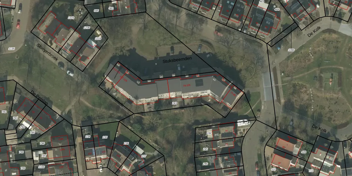 Stuksbeemden 93 is gelegen op kadastraal perceel HOR01R243. Deze kadastrale aanduiding is uniek en wordt gebruikt door het Kadaster om eigendomsrechten en andere zakelijke rechten vast te leggen. Het perceel maakt onderdeel uit van de kadastrale gemeente Horst.