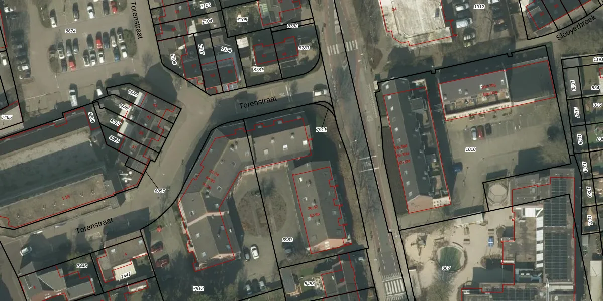 Het perceel waarop Torenstraat 34 staat heeft een oppervlakte van 1490 m². Dit is een zeer groot perceel. De perceeloppervlakte wordt geregistreerd door het Kadaster. Gedetailleerde informatie over de maten van dit perceel kunt u vinden in het rapport Kadastrale kaart met maatvoering van Torenstraat 34.