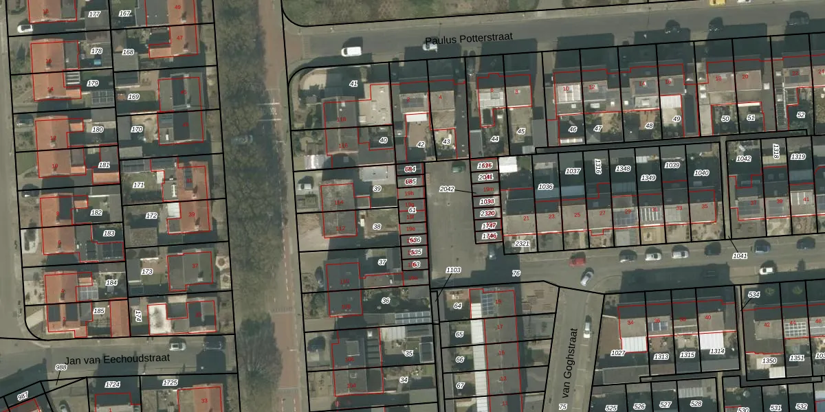 Het perceel waarop van Goghstraat 19-g staat heeft een oppervlakte van 38 m². Dit is een klein perceel. De perceeloppervlakte wordt geregistreerd door het Kadaster. Gedetailleerde informatie over de maten van dit perceel kunt u vinden in het rapport Kadastrale kaart met maatvoering van van Goghstraat 19-g.