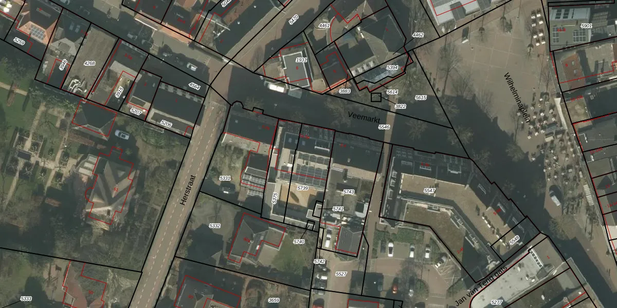 Het perceel waarop Veemarkt 5-g staat heeft een oppervlakte van 375 m². Dit is een groot perceel. De perceeloppervlakte wordt geregistreerd door het Kadaster. Gedetailleerde informatie over de maten van dit perceel kunt u vinden in het rapport Kadastrale kaart met maatvoering van Veemarkt 5-g.