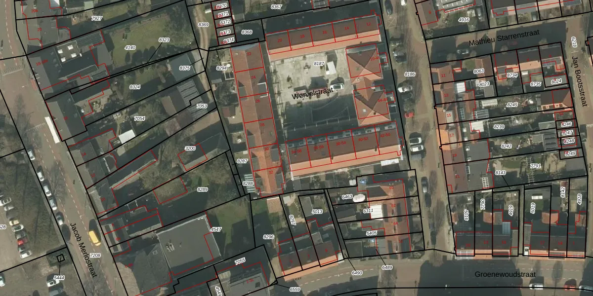 Wervelstraat 34 is gelegen op kadastraal perceel HOR01B8187. Deze kadastrale aanduiding is uniek en wordt gebruikt door het Kadaster om eigendomsrechten en andere zakelijke rechten vast te leggen. Het perceel maakt onderdeel uit van de kadastrale gemeente Horst.