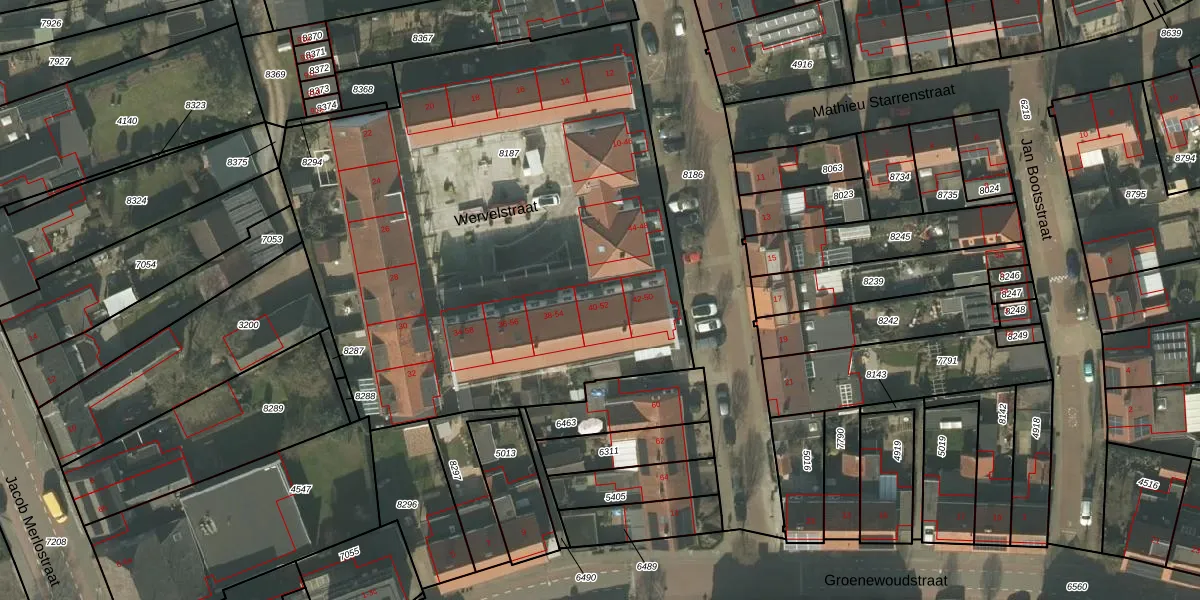 Wervelstraat 40 is gelegen op kadastraal perceel HOR01B8187. Deze kadastrale aanduiding is uniek en wordt gebruikt door het Kadaster om eigendomsrechten en andere zakelijke rechten vast te leggen. Het perceel maakt onderdeel uit van de kadastrale gemeente Horst.