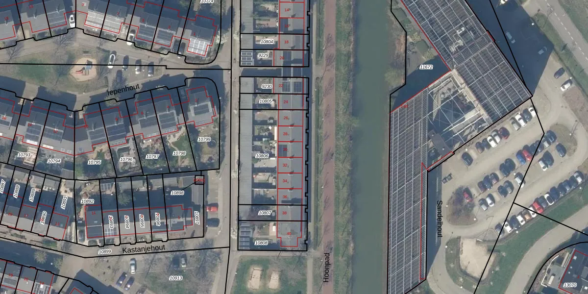 Het perceel waarop het adres ligt is HTN04-A-10806. De afkorting 'HTN04' staat voor kadastrale gemeente Houten. Het perceel is kleiner dan gemiddeld in Houten. Het perceel is 756 m² groot, terwijl het gemiddelde ligt op 2869,64 m². De grootste perceeloppervlakte in de kadastrale gemeente is 45,3 ha. De kleinste oppervlakte bedraagt 0 m². Op het perceel zijn 6 adressen aanwezig. De huidige grenzen van het perceel zijn digitaal in de Basisregistratie Kadaster (BRK) geregistreerd op 06-03-2012.