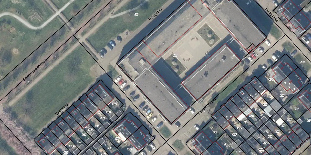 Het perceel waarop Boogmuur 107 staat heeft een oppervlakte van 4336 m². Dit is een zeer groot perceel. De perceeloppervlakte wordt geregistreerd door het Kadaster. Gedetailleerde informatie over de maten van dit perceel kunt u vinden in het rapport Kadastrale kaart met maatvoering van Boogmuur 107.