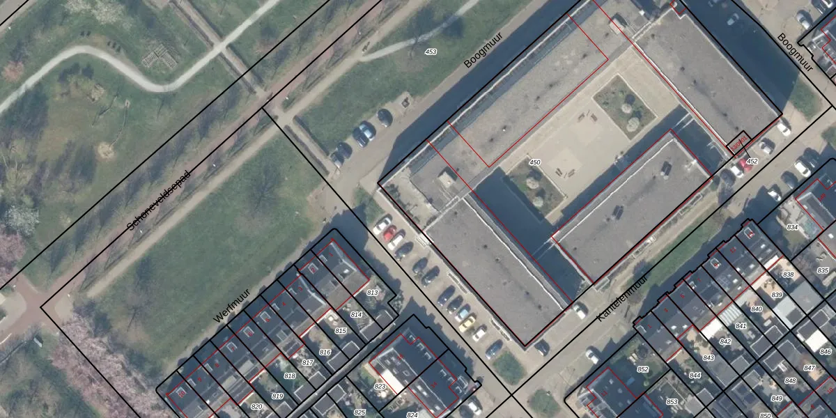 Het perceel waarop Boogmuur 13 staat heeft een oppervlakte van 4336 m². Dit is een zeer groot perceel. De perceeloppervlakte wordt geregistreerd door het Kadaster. Gedetailleerde informatie over de maten van dit perceel kunt u vinden in het rapport Kadastrale kaart met maatvoering van Boogmuur 13.