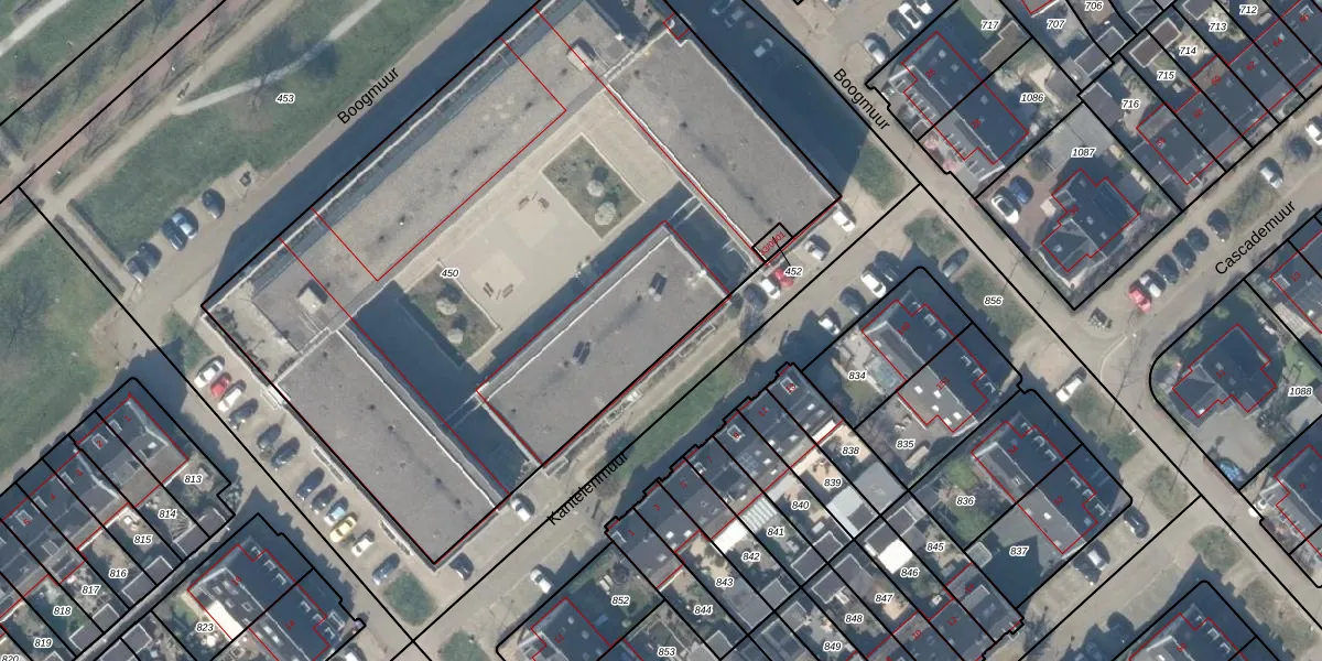 Het perceel waarop Boogmuur 31 staat heeft een oppervlakte van 4336 m². Dit is een zeer groot perceel. De perceeloppervlakte wordt geregistreerd door het Kadaster. Gedetailleerde informatie over de maten van dit perceel kunt u vinden in het rapport Kadastrale kaart met maatvoering van Boogmuur 31.
