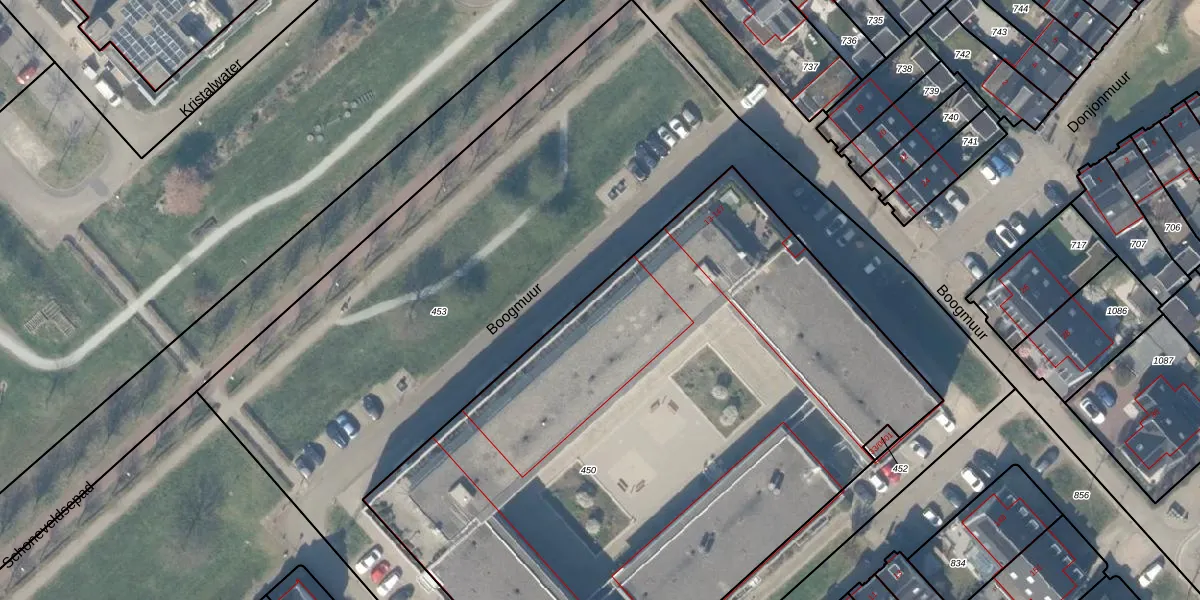 Boogmuur 45 is gelegen op kadastraal perceel HTN04H450. Deze kadastrale aanduiding is uniek en wordt gebruikt door het Kadaster om eigendomsrechten en andere zakelijke rechten vast te leggen. Het perceel maakt onderdeel uit van de kadastrale gemeente Houten.