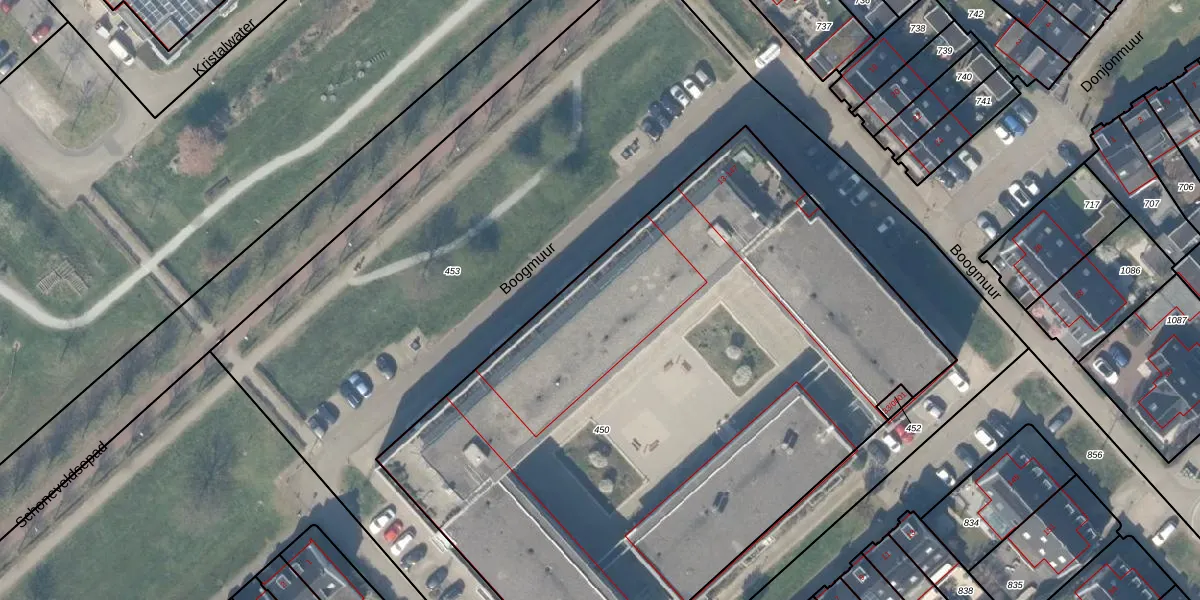 Het perceel waarop Boogmuur 93 staat heeft een oppervlakte van 4336 m². Dit is een zeer groot perceel. De perceeloppervlakte wordt geregistreerd door het Kadaster. Gedetailleerde informatie over de maten van dit perceel kunt u vinden in het rapport Kadastrale kaart met maatvoering van Boogmuur 93.