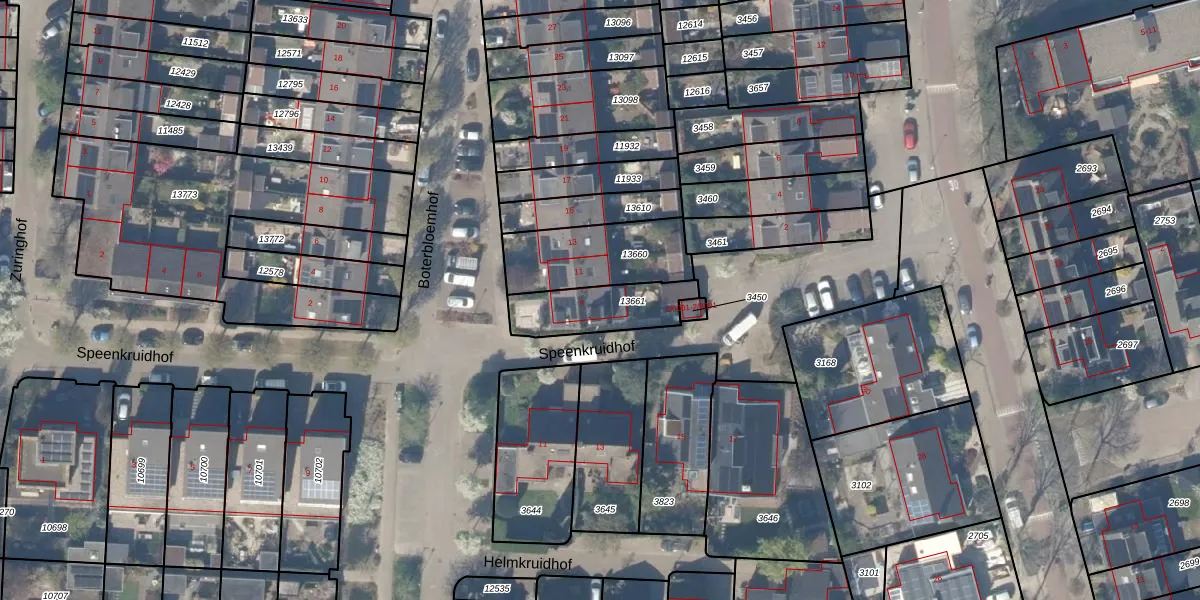 Boterbloemhof 9 is gelegen op kadastraal perceel HTN04A13661. Deze kadastrale aanduiding is uniek en wordt gebruikt door het Kadaster om eigendomsrechten en andere zakelijke rechten vast te leggen. Het perceel maakt onderdeel uit van de kadastrale gemeente Houten.