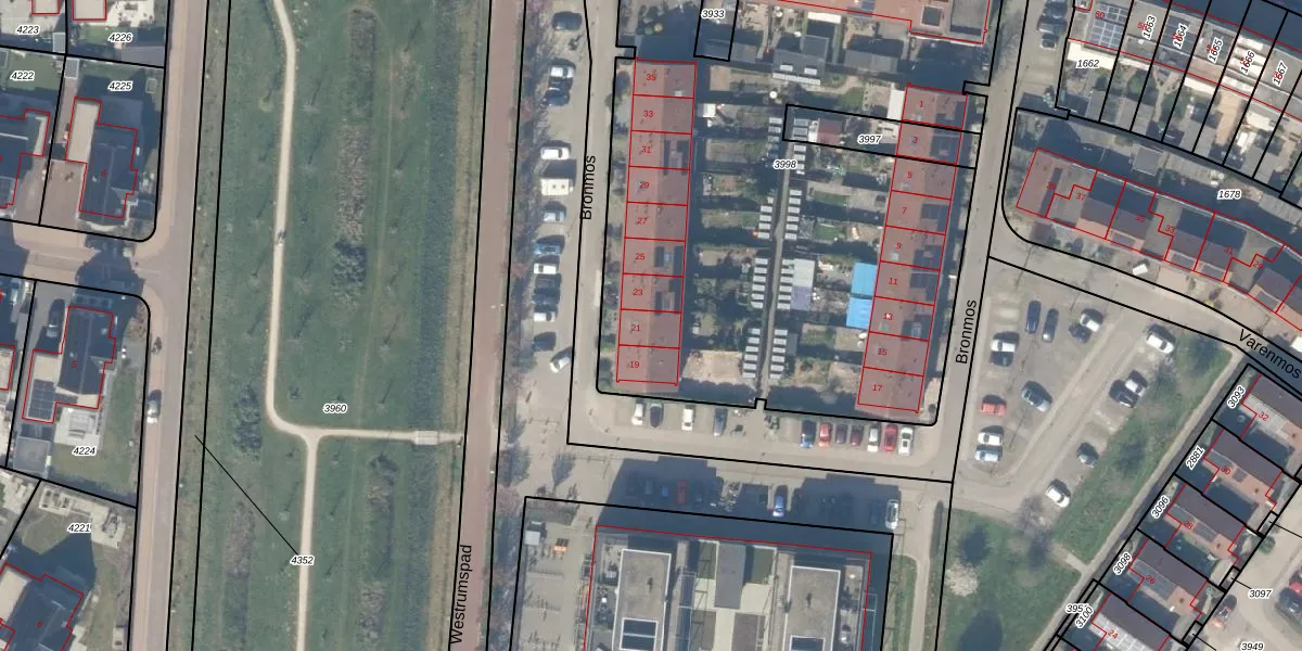 Het perceel waarop Bronmos 21 staat heeft een oppervlakte van 3921 m². Dit is een zeer groot perceel. De perceeloppervlakte wordt geregistreerd door het Kadaster. Gedetailleerde informatie over de maten van dit perceel kunt u vinden in het rapport Kadastrale kaart met maatvoering van Bronmos 21.