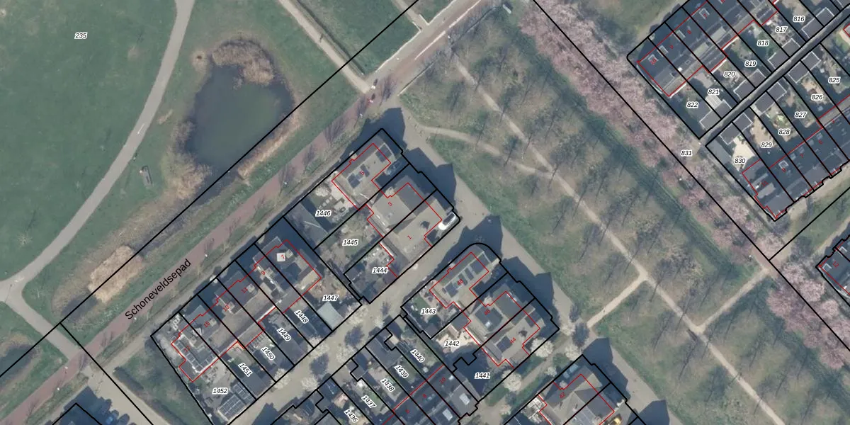 Het perceel waarop het adres ligt is HTN04-H-1444. De afkorting 'HTN04' staat voor kadastrale gemeente Houten. Het perceel is 277 m² groot. Dat is kleiner dan de gemiddelde perceeloppervlakte in Houten, dat op 2871,04 m² ligt. Het kleinste perceel in de kadastrale gemeente is 0 m² groot. De grootste perceeloppervlakte is 45,3 ha. Dit is het enige adres dat aanwezig is op het perceel. De huidige grenzen van het perceel zijn digitaal in de Basisregistratie Kadaster (BRK) geregistreerd op 03-08-2009.