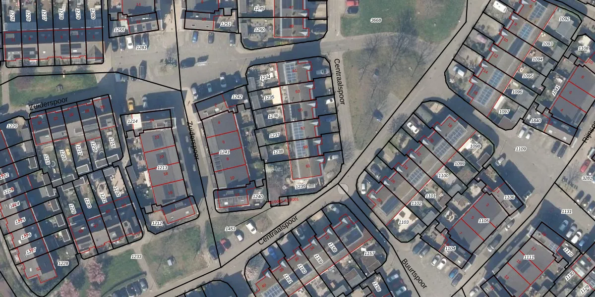 Centraalspoor 59 is gelegen op kadastraal perceel HTN04B1238. Deze kadastrale aanduiding is uniek en wordt gebruikt door het Kadaster om eigendomsrechten en andere zakelijke rechten vast te leggen. Het perceel maakt onderdeel uit van de kadastrale gemeente Houten.