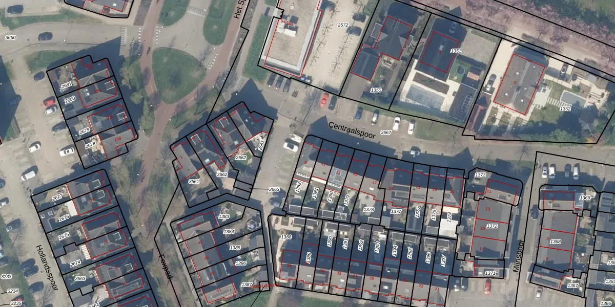 Centraalspoor 9 is gelegen op kadastraal perceel HTN04B1382. Deze kadastrale aanduiding is uniek en wordt gebruikt door het Kadaster om eigendomsrechten en andere zakelijke rechten vast te leggen. Het perceel maakt onderdeel uit van de kadastrale gemeente Houten.