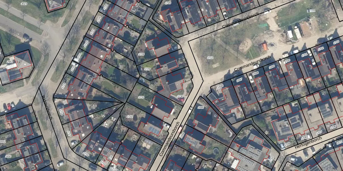 Het perceel waarop Commandeursborch 6 staat heeft een oppervlakte van 380 m². Dit is een groot perceel. De perceeloppervlakte wordt geregistreerd door het Kadaster. Gedetailleerde informatie over de maten van dit perceel kunt u vinden in het rapport Kadastrale kaart met maatvoering van Commandeursborch 6.