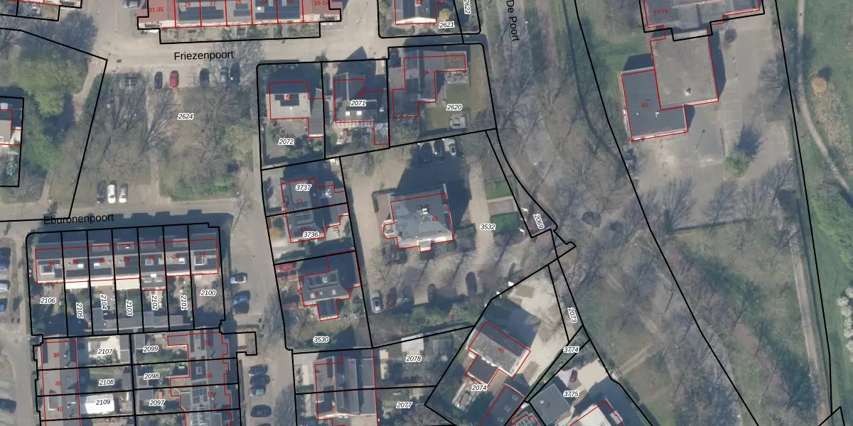 Het perceel waarop De Poort 42 staat heeft een oppervlakte van 1695 m². Dit is een zeer groot perceel. De perceeloppervlakte wordt geregistreerd door het Kadaster. Gedetailleerde informatie over de maten van dit perceel kunt u vinden in het rapport Kadastrale kaart met maatvoering van De Poort 42.